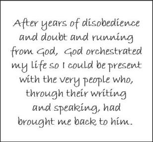 As I mused about these miracles, a tsunami of gratitude flowed over me. After years of disobedience and doubt and running from God, God orchestrated my life so I could be present with the very people who, through their writing and speaking, had brought me back to him.