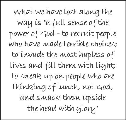 “we have had it drilled into our heads that God helps those who help themselves.” What we have lost along the way is “a full sense of the power of God – to recruit people who have made terrible choices; to invade the most hapless of lives and fill them with light; to sneak up on people who are thinking of lunch, not God, and smack them upside the head with glory” (p.38). Taylor argues that this passage is another miracle story, just like those where Jesus said “be made clean,” or “stand up, take your mat and go home,” or “go, your faith has made you well.” Only this time he says, “Follow me.”